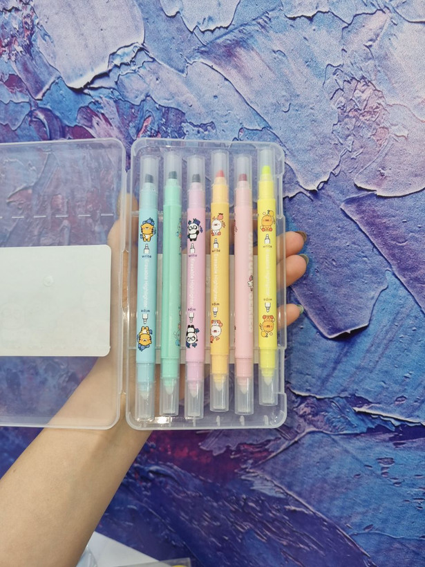 ماژیک هایلایتر طرح عروسکی 6 رنگ فسفری پاستلی دو سر پاک شونده پاک کن دار